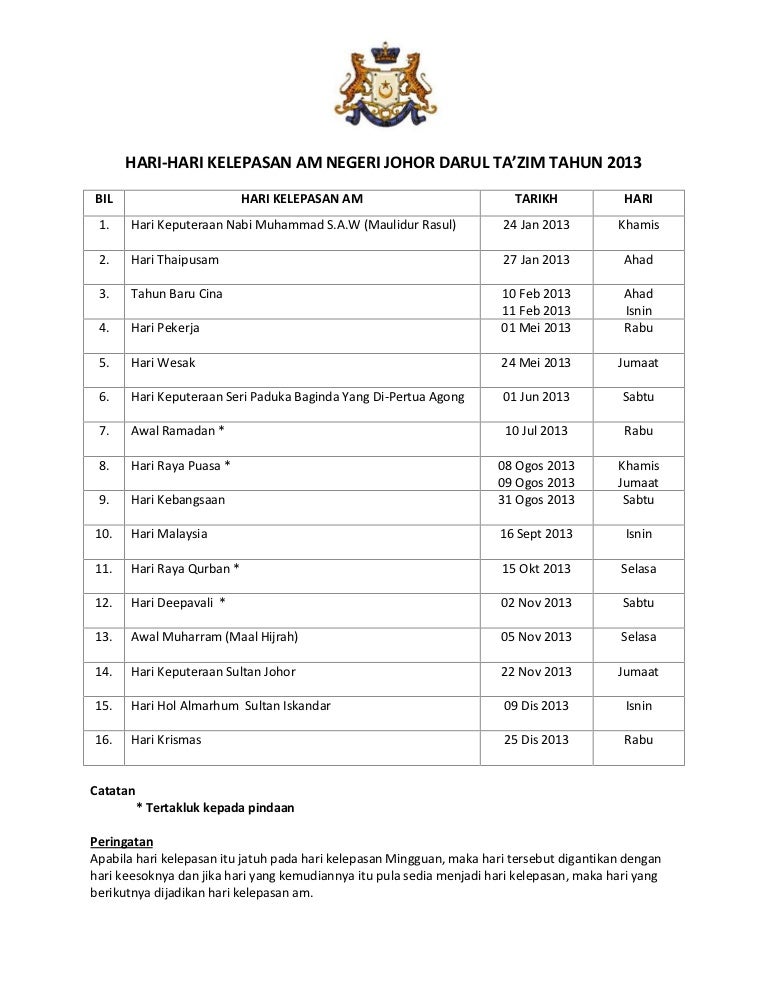 Takwim Hari Kelepasan Am Negeri Johor Bagi Tahun 2013